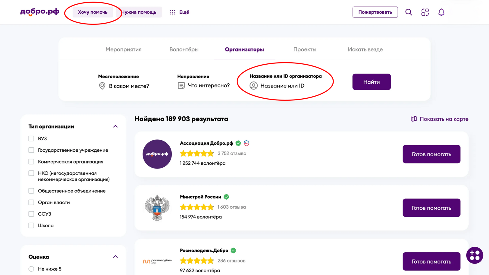 - Найдите нас в разделе «Организаторы» по названию «Дом «ИНСИТИ» и нажмите «Готов помогать».
